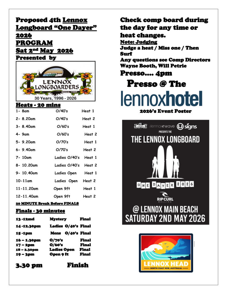 29 April 2026 4th Lennox Longboard ONE-DAYER 2026. Heat Draws & Program Heat Draws Open Ladies HeatsDownload Open Mens heatsDownload Over 40’s Ladies- Heats 2026Download Over 40’s- Heats 2026Download Over 60’s heatsDownload Over 70’s heatsDownload EVENT PROGRAM The 4th Lennox Longboard One Dayer 2026 ProgramDownload